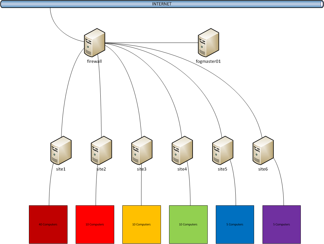 Lets start with setup we have here. We have fogmaster-named server that runs FOG 1.20. Then we have six storage nodes that also runs FOG 1.20 but only storage-node install of the FOG.